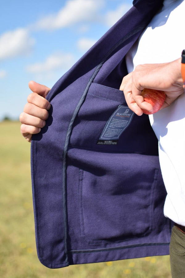 Features one internal pocket and three external pockets (including buttoned breast pocket).